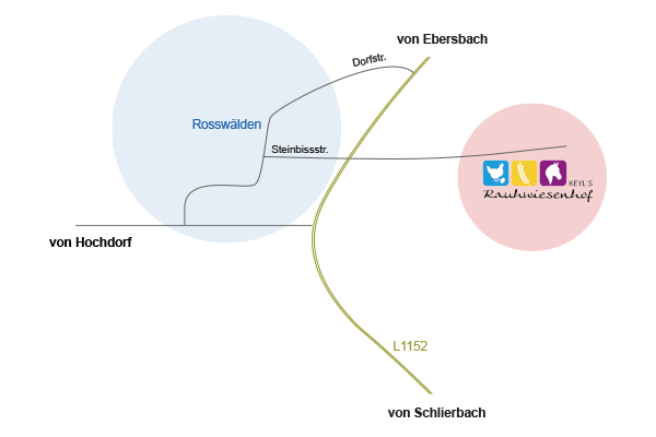 Fahren Sie die erste offizielle Einfahrt nach Rosswälden hinein. Die nächst mögliche Strasse (am Farrenstall) nach rechts. Die nächste Möglichkeit gleich wieder Rechts. Dann der Strassenführung bis zur Kreissparkasse folgen. Dort biegen Sie rechts in die Steinbissstrasse ein. Folgen Sie dieser bis Sie unter einer Brücke durchkommen. Danach noch ca. 1km und zu Ihrer rechten liegt der Rauhwiesenhof.